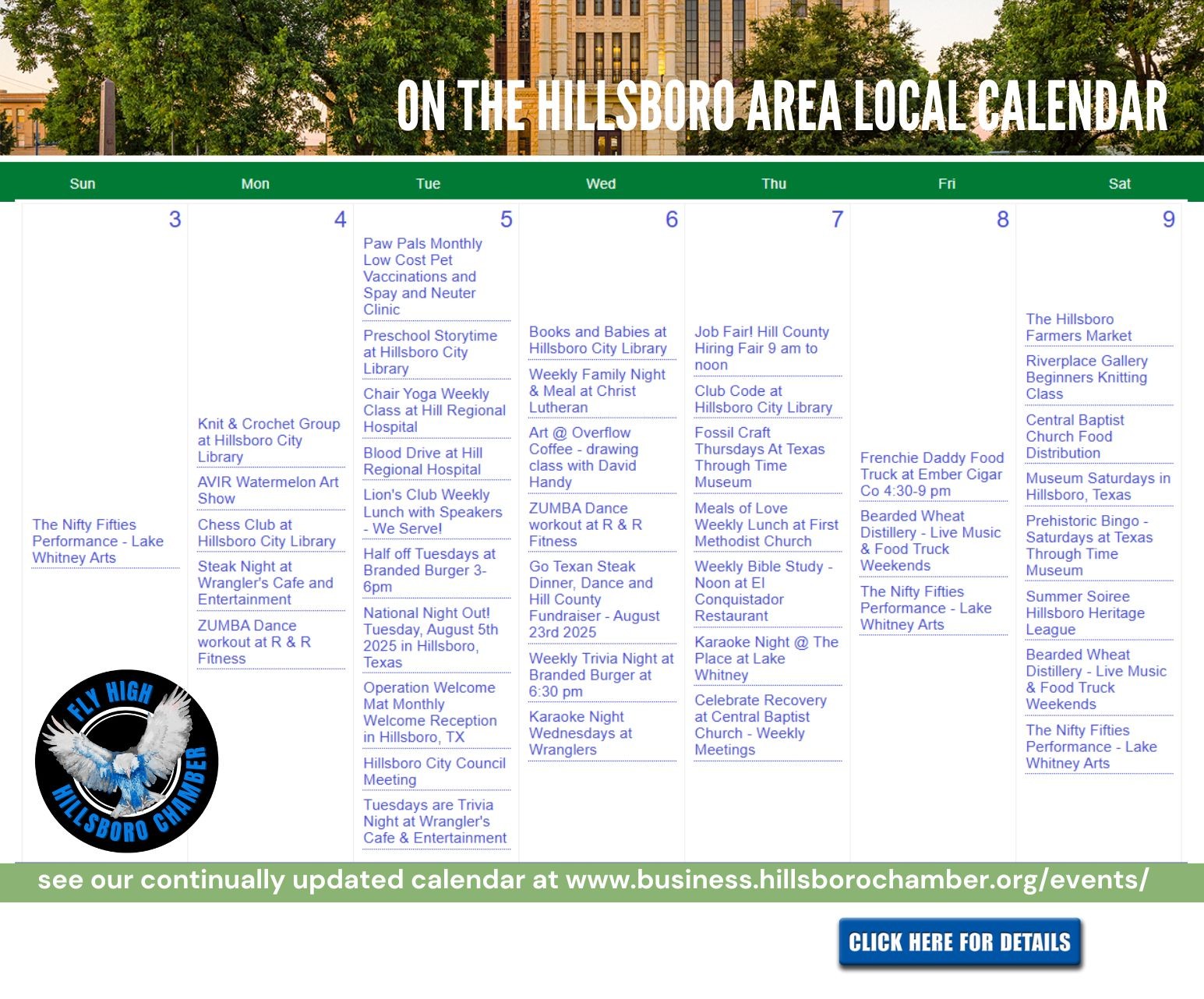 See our local events calendar, and join us at events, or visit the Hillsboro Chamber of Commerce at our MKT Railroad Depot building, visitor center and office. We love talking about business, Hillsboro, events, growth, and whatever else is on your mind.