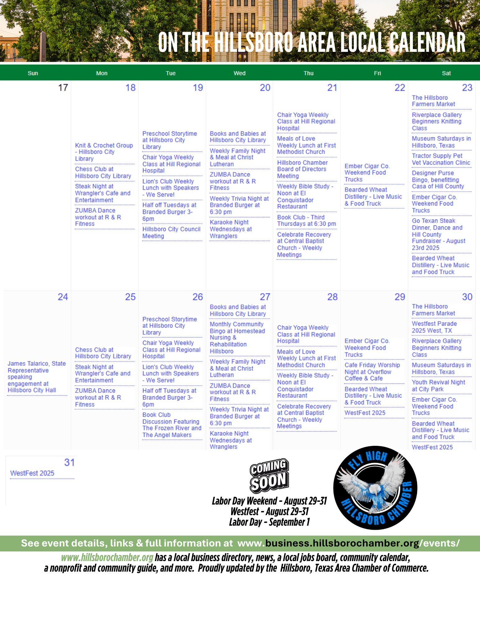 Call 254-582-2481 if you have questions about upcoming events or need resources in Hillsboro. The Hillsboro Texas Area Chamber of Commerce runs the community calendar, but can also help with visitor resources and concierge information about businesses, venues, and just about everything else in Hillsboro.