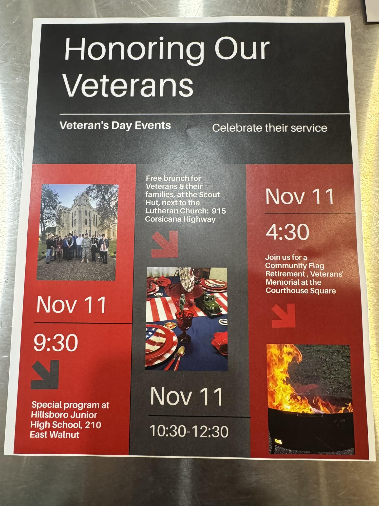 Veterans Day Commemorative Events Schedule for Tuesday, November 11th 2025 in Hillsboro, Texas