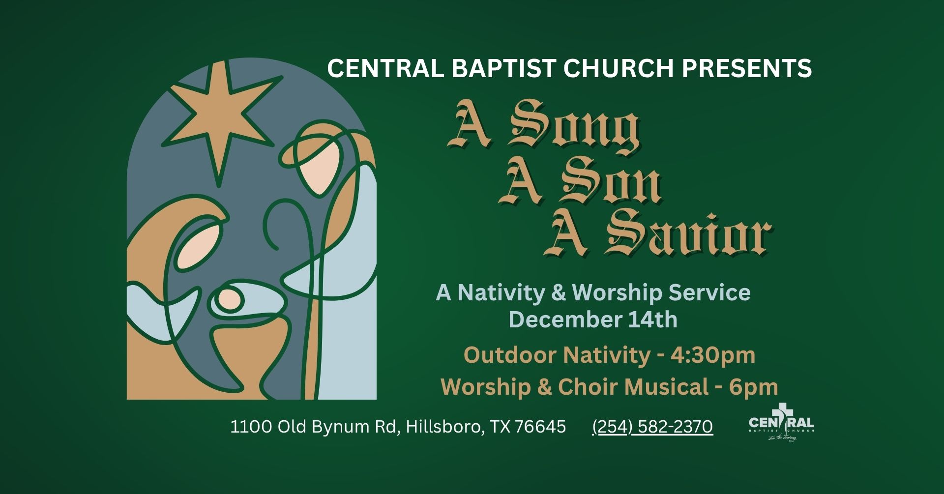 Sunday, December 14th 4:30 to 7:30 pm Live Nativity and Worship Service at Central Baptist Church