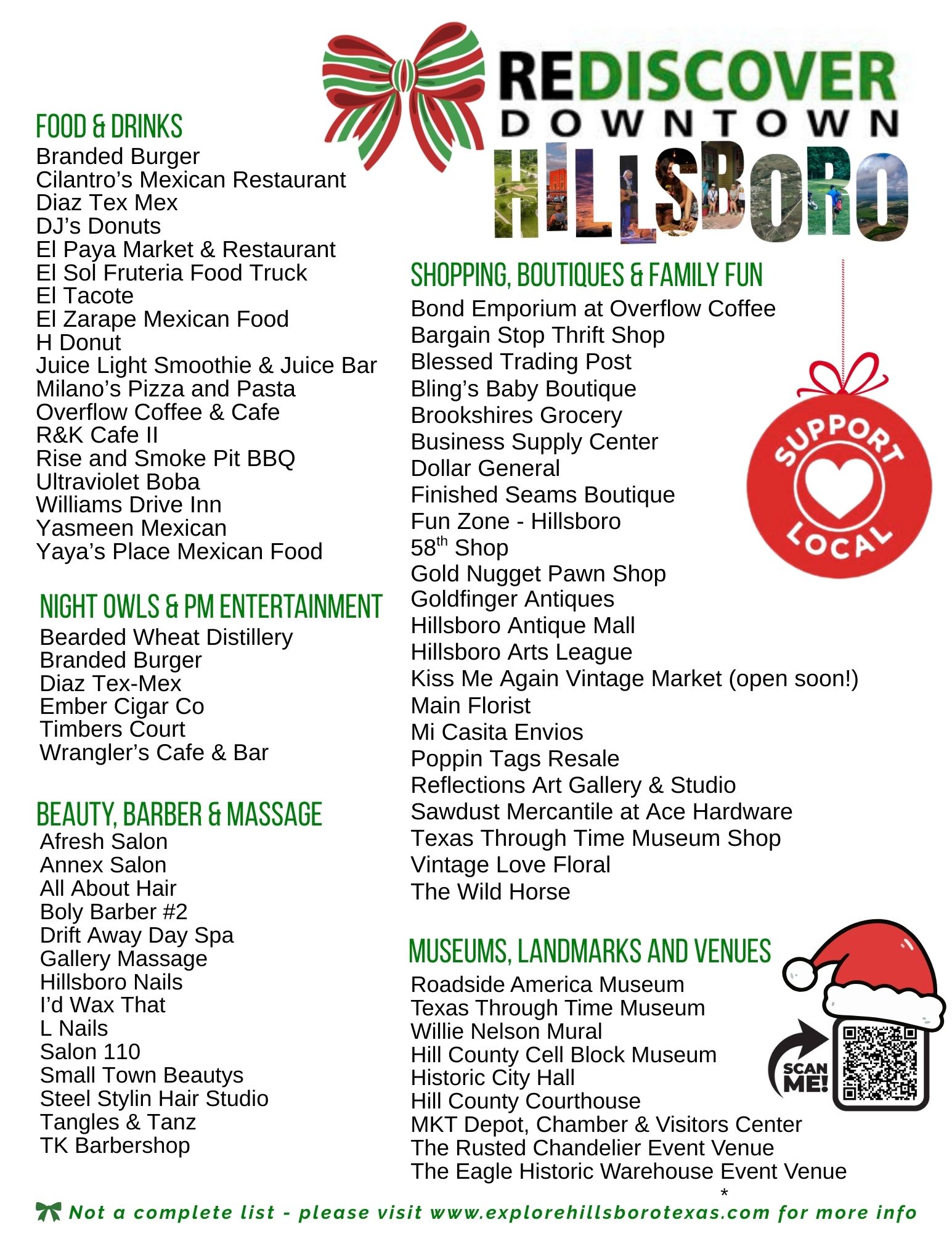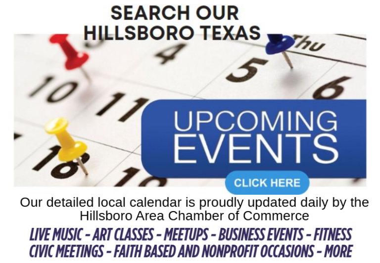 Questions about local events? Call the Hillsboro Chamber of Commerce at 254-582-2481 or email memberservices@hillsborochamber.org