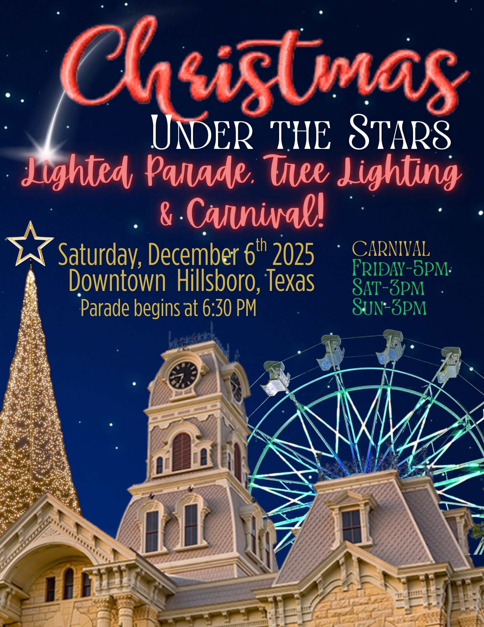 Saturday, December 6th 6 pm Christmas Under the Stars Parade Carnival and Tree Lighting