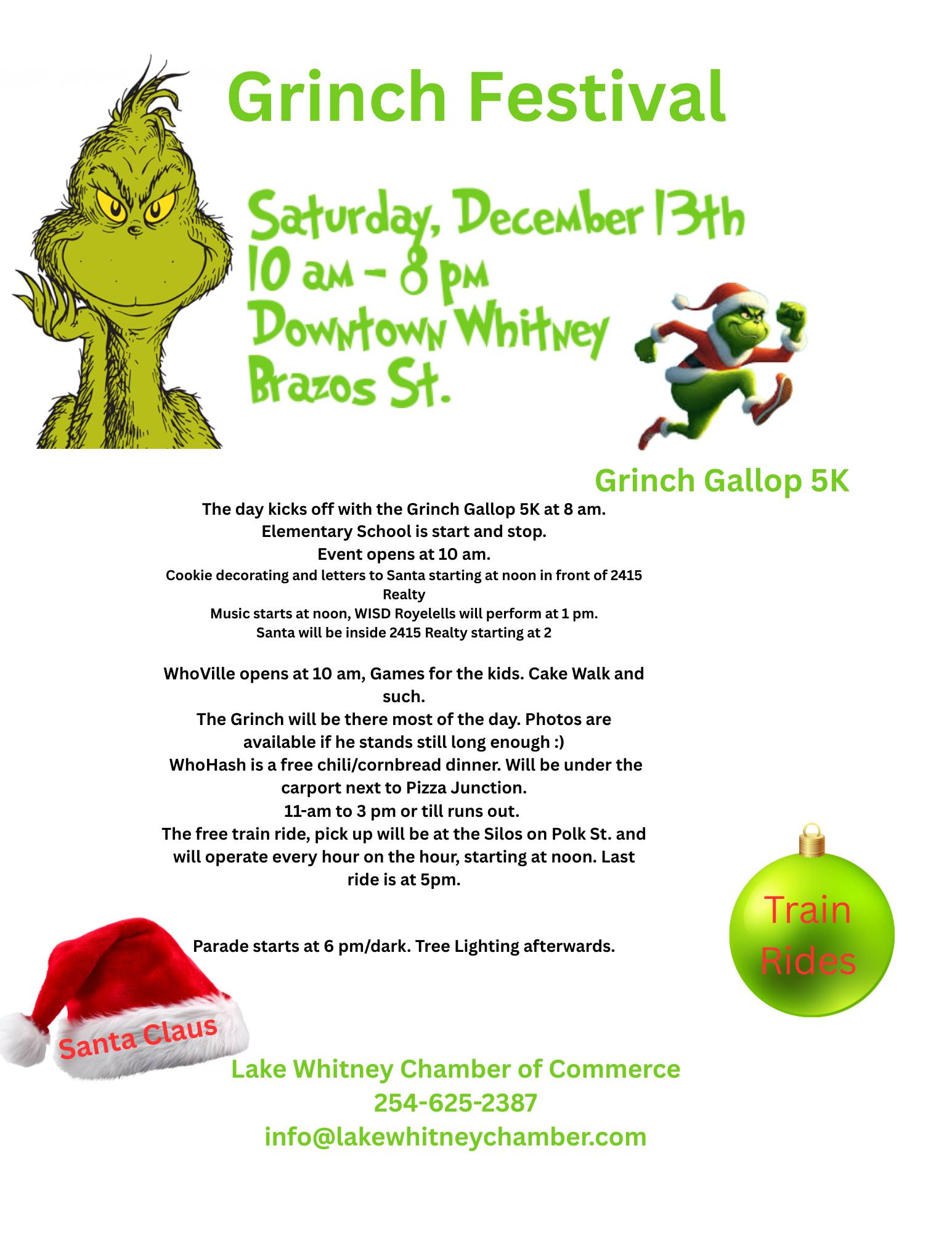 Saturday, December 13th 8-5pm Grinch Festival and Parade in Downtown Whitney