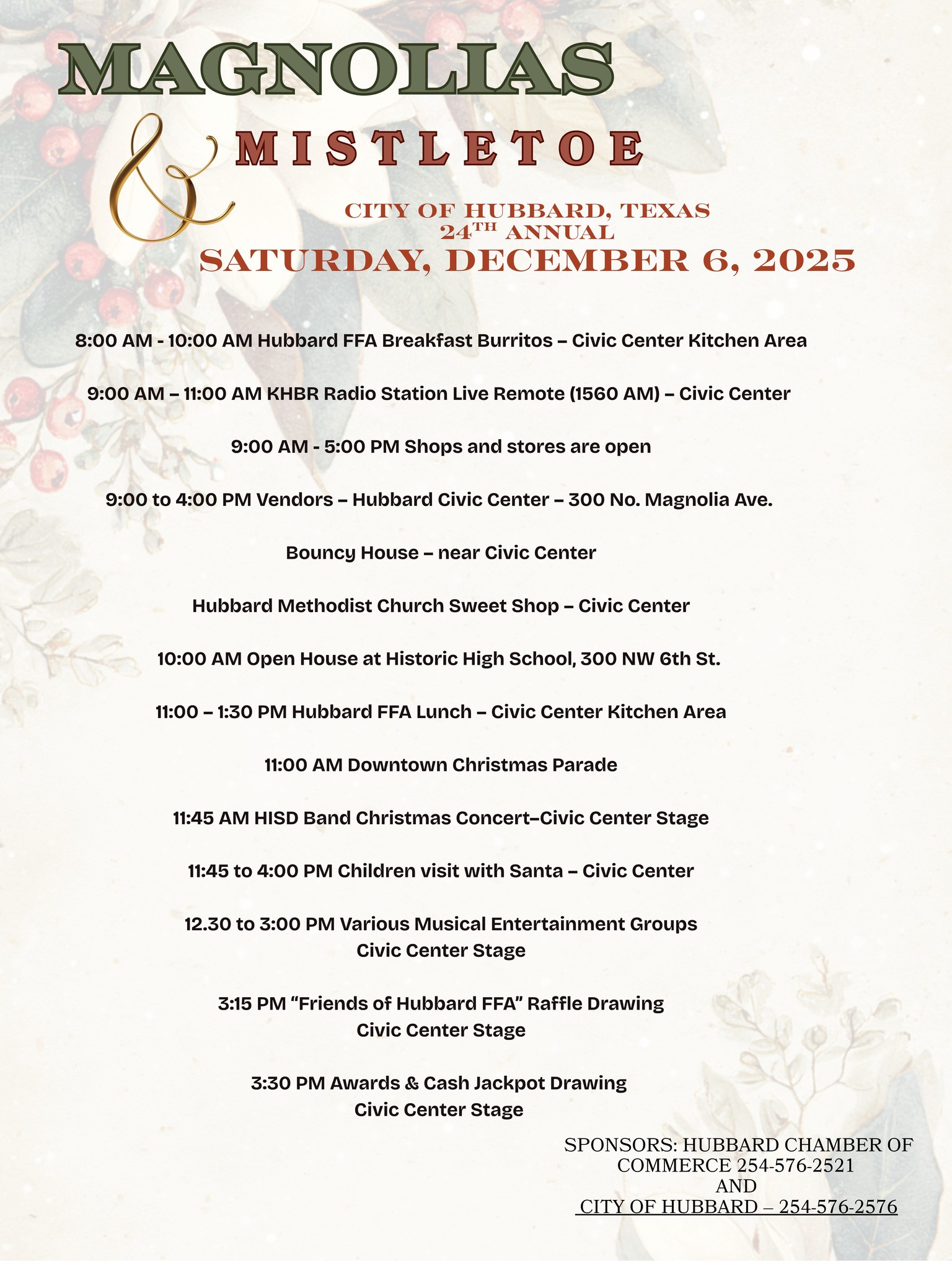 Saturday, December 6th 8-5 pm Magnolias and Mistletoe Christmas Celebration in Hubbard