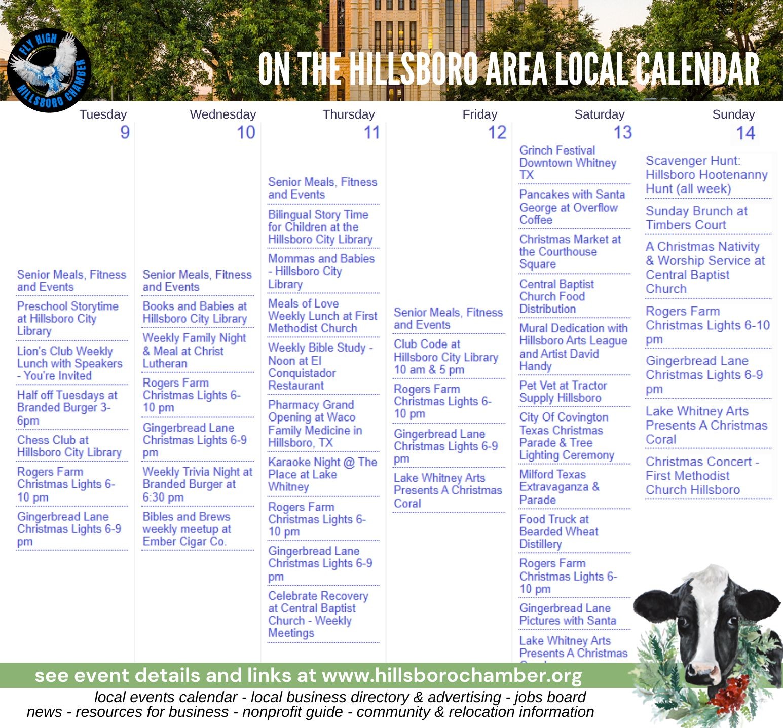 Questions about local events? Call the Hillsboro Chamber of Commerce at 254-582-2481 or email memberservices@hillsborochamber.org