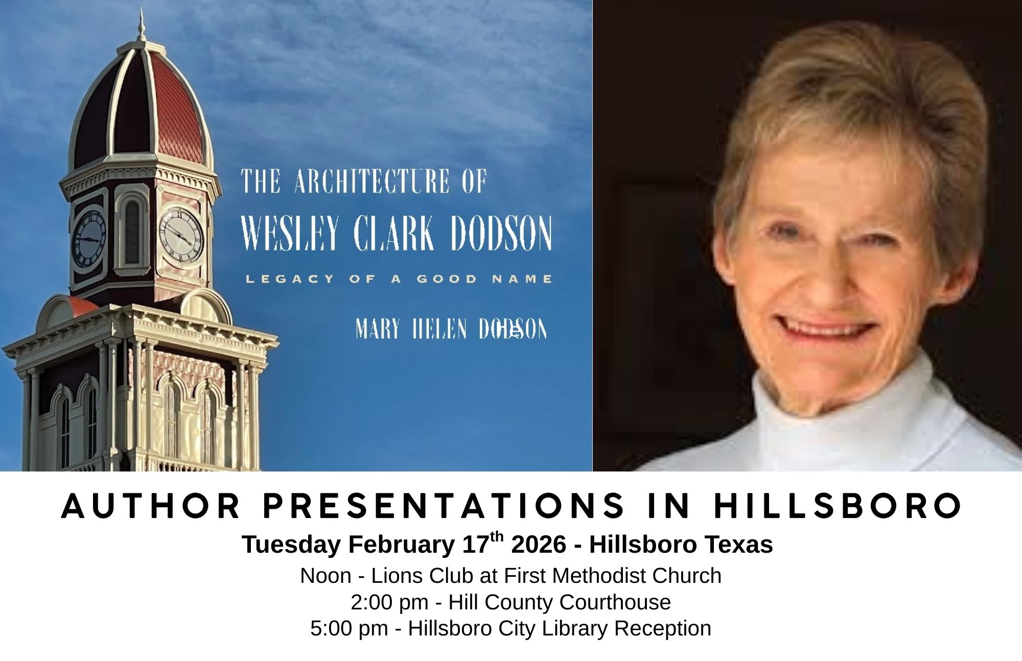 Author Mary Helen Dodson is stopping in Hillsboro on her Texas book tour in February. There will be three opportunities to meet the author, and pick up a copy of her new book, The Architecture of Wesley Clark Dodson.