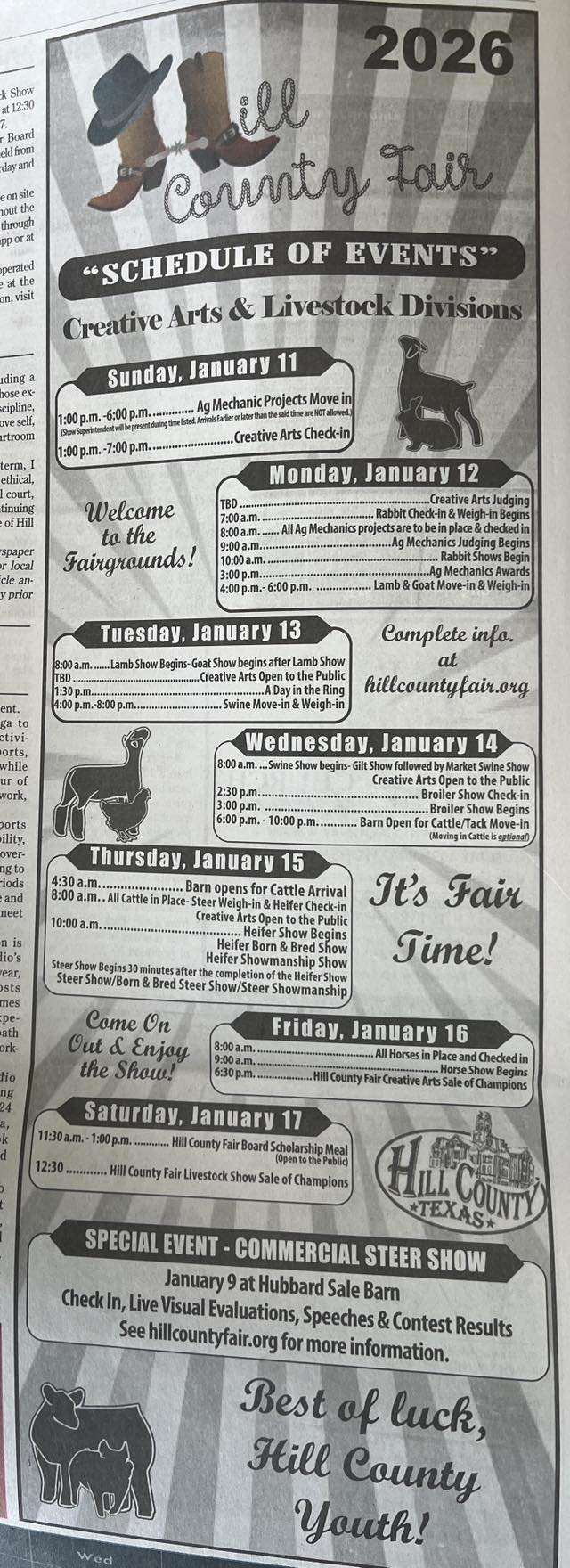 The Hill County Fair returns January 11th through 17th. See the full schedule of showtimes, and make a plan to enjoy a day at the fair (or two or three (or all of them).
