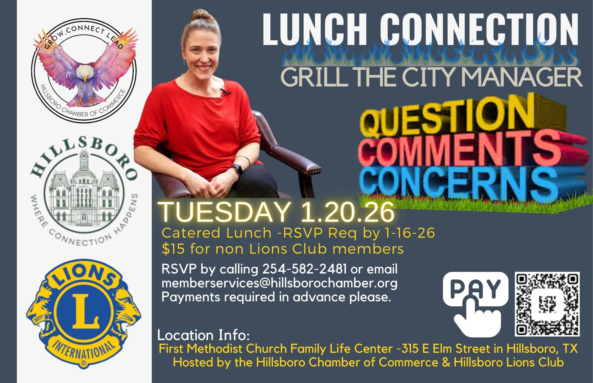 Also of note, the Hillsboro City Manager Megan Henderson will be at a lunch hosted by the Hillsboro Chamber of Commerce on Tuesday, January 20th. Reservations are required for the Quarterly Connection Lunch. Please call 254-582-2481 or email memberservices@hillsborochamber.org.