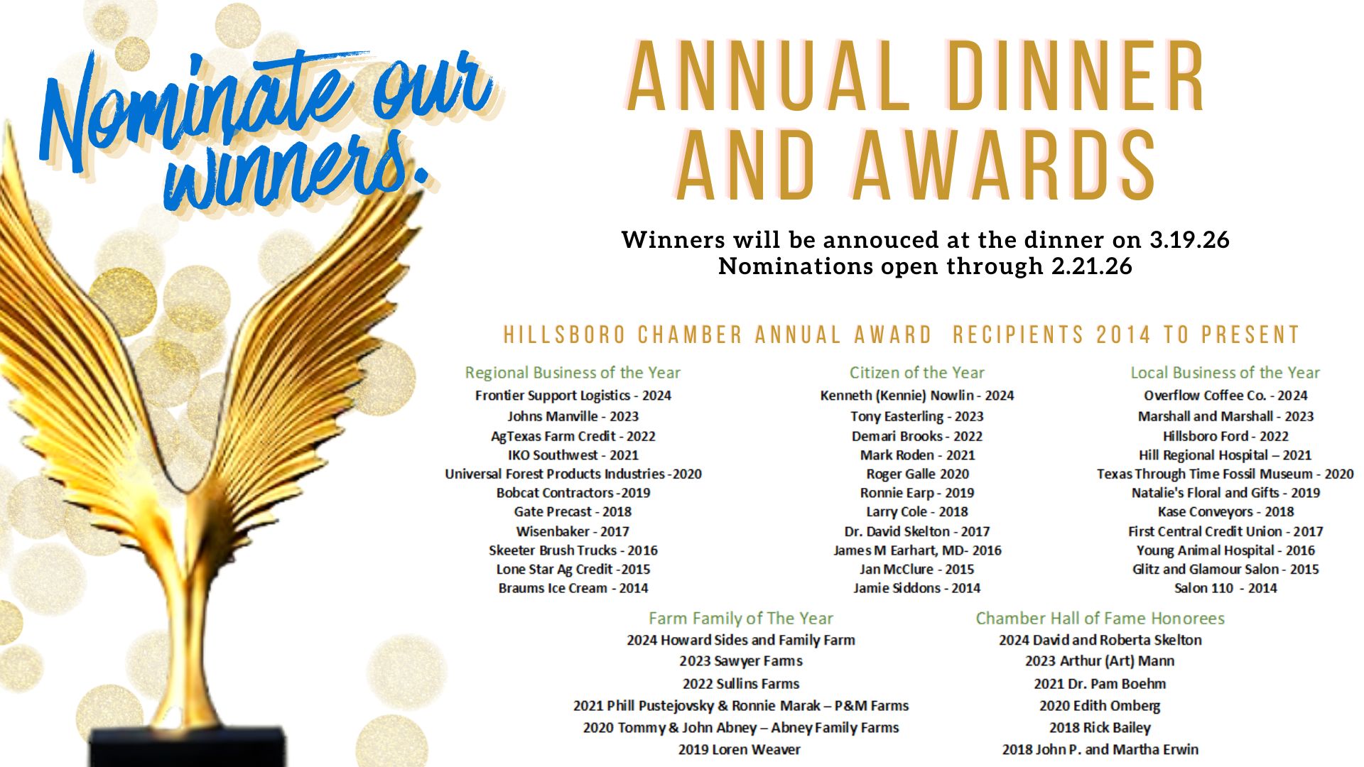 The winners will be announced and honored at our annual Chamber dinner on Thursday, March 19th 2026.