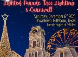 It’s the most wonderful time of the year in Hillsboro, Texas. We are proving a list of our largest area events and celebrations below. (Nightly) Nov 21-Jan 4 6-10 pm (nightly) Rogers Farms Christmas Light ShowFriday, December 5th 3pm to close Triple T Amusements Christmas Carnival DowntownFriday, December 5th 7-9 pm Ghosts of Hill County…