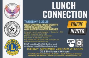 In a casual lunch, you can enjoy hearing from leaders, among leaders. Please make reservations early as the quarterly connections lunch event is expected to sell out quickly. Call the Hillsboro Chamber at 254-582-2481 or email memberservices@hillsborochamber.org to reserve your spot. Join us for lunch with speakers Hill County Judge Shane Brassell and Sheriff Hunter…